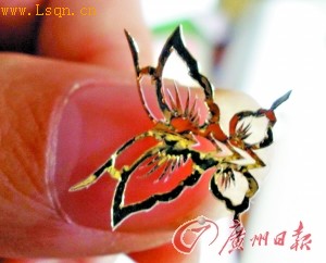 作为一个传统的民间艺术工作者,姜婵告诉记者,她从新闻中看到有人在指甲上写毛笔字,灵感顿生:自己能不能也在指甲大小的纸上剪出作品呢?于是,凭着十余年的剪纸扎实基础,几经试验,她很快就剪出了满意的作品。她说,在大幅剪纸作品中搭配一些微型剪纸,既能配景,又可以起到锦上添花的作用。(记者 卜瑜 通讯员 郭竹松 摄影报道
