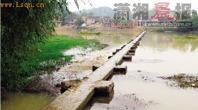 新邵县文物部门近日在进行第三次全国文物普查时发现了一座踏水桥。文物专家介绍,该桥始建于明代,距今已有500余年的历史,虽多次经历洪水冲刷,但整体结构尚好,没有坍塌。 该桥位于新邵县小塘镇渡头桥村与大院村之间,横跨石马江,全长128米。桥以松木打桩为基础,上铺圆木建成桥楼,在桥楼上部立有墩面,每个墩面又立有一个锥形青石墩,一共有52块石墩,桥面上铺设有54块大型青石板。人立于桥上,桥基底部被水淹没,因此无法看见木架桥楼,只有石墩和石板还清楚可见。