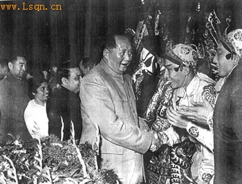 资料图片:毛泽东与演员们亲切握手