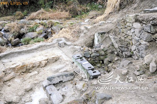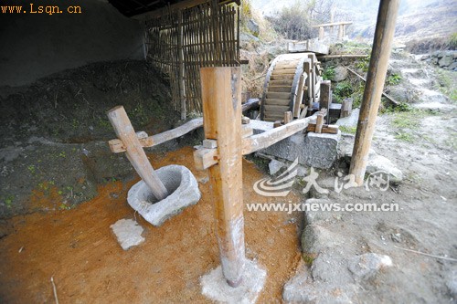 3号水碓西侧闲置的一个替换出来的穿孔石臼足以见证其年代之久远。