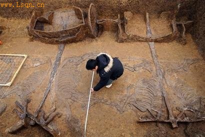 专家还介绍,从车马坑发掘的一块青铜器上,还发现了6个字的铭文,铭文清晰的记载年代为公元前344年,这意味着严仓墓不会早于这一年代,专家据此推断该墓所处年代为战国中晚期。