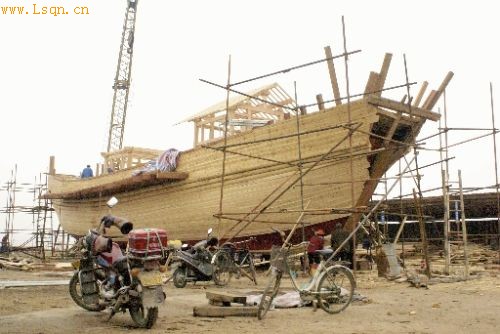 仿造的日本“遣唐使船”正在上海附近造船厂中加紧建造。(日本新华侨报网图片)