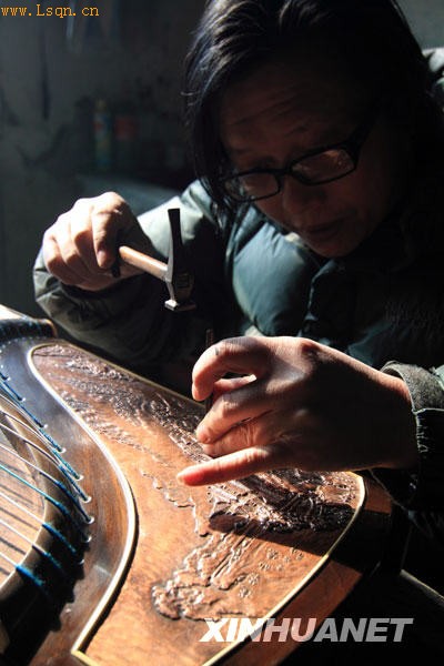 1月28日,江苏扬州江都市的金银细工制作技艺传承人方学斌在制作细工铜质錾画古筝。新华社发(郁兴 摄)