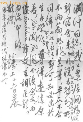 顷奉惠寄尊译青莲诗选,甚感。太白能通夷语,明人小说中敷陈其“草写吓蛮书”,惜其尚未及解红毛鬼子语文,不然,与君苟并世,必莫逆于心耳。专此致谢,即颂