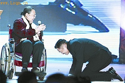 被誉为2010中国第一史诗巨片的《孔子》,1月中旬在北京举行首映庆典,庆典上孔子的第77代嫡孙女孔德懋女士坐着轮椅上台,周润发便一直在旁边像子侄一样跪着听老太太讲话。孔德懋女士盛赞周润发在电影《孔子》中饰演孔子的精彩表演,并将写有“永远的孔子”的横幅赠送给发哥。这时,周润发出人意料地向孔女士认真双膝跪地叩首,随后,与孔女士温情拥抱,场面令人动容……