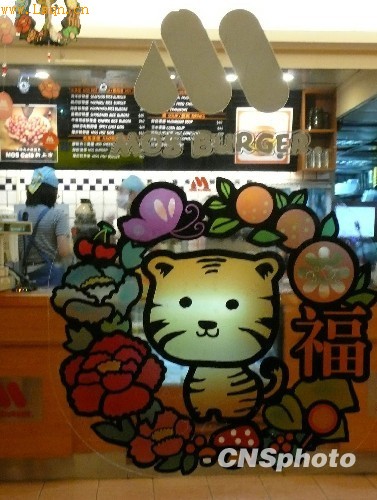 虎年伊始,台北街头的“笑面虎”造型比比皆是,显得喜庆祥瑞。图为店铺玻璃门上的卡通虎在笑着招徕客人。中新社发闫晓虹摄