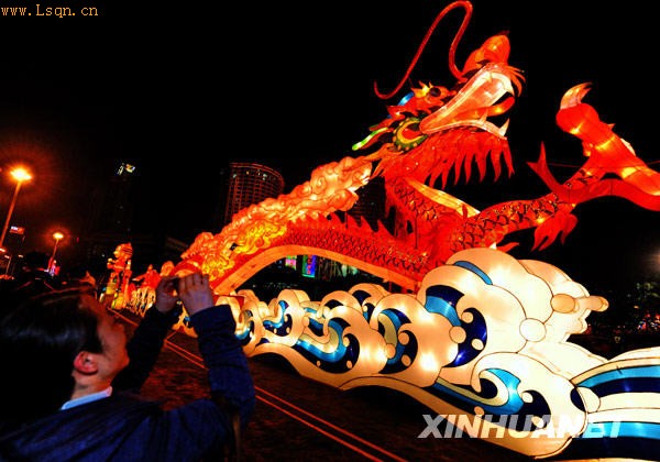 2月24日,一位市民在福州南后街元宵灯会上拍摄巨型龙灯。新华社记者 张国俊 摄