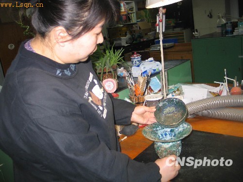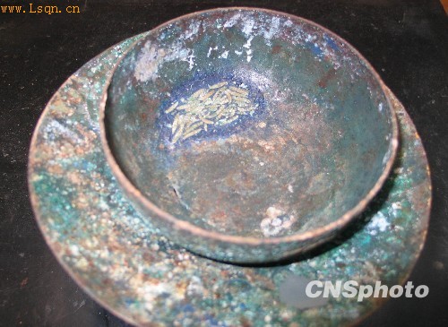 入选为2009中国考古六大新发现之一的西安蓝田县五里头村北宋吕氏家族墓地,共出土了数十件主要用途为茶具的渣斗,分为陶、瓷、石、铜等材质。其中一件铜质渣斗内发现了距今近千年的珍贵茶叶,大约有30多根,经考证是产自福建的珍贵白茶,能够保存至今的茶叶实物在中国考古史上极为罕见。图为3月2日考古人员在展示渣斗。 中新社发 冽玮 摄