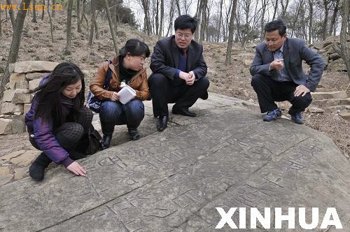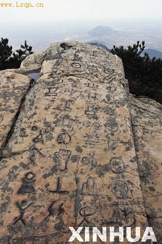 3月30日在山东日照天台山拍摄的刻有图案和文字的巨石。