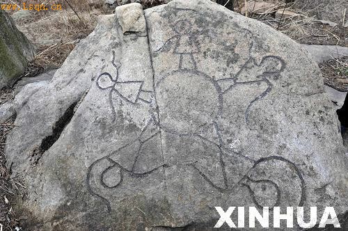 3月30日在山东日照天台山拍摄的刻有舞蹈图案的石块。