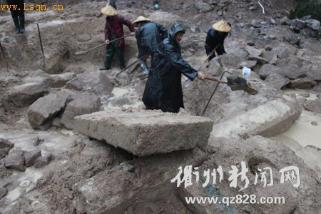 昨日上午,龙游南部大雨倾盆,记者来到古墓发掘现场时,还有少数几位工作人员正在做简单的清理工作。古墓现场位于一处民房地基施工现场,背靠一处荒山。墓地最为显眼的是数块大型青石构件和几块散落的青砖,青石和青砖都是古墓在民房施工时被挖掘出来的。