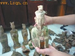据了解,此次出土了包括青釉碗、双耳罐、文吏俑、生肖俑、男侍俑、女侍俑等多种类型的近 40件文物,其中,出土完整的文物有3件陶俑。较之以前该县出土的同类物品,此次出土文物的做工更加精细。刘红彬介绍,这次墓室里面出土的陶俑,它的釉色比以前要施得厚一些,显得比以前要鲜亮,陶俑品种要多一些。刘红彬手拿刚清理出来的一件陶俑介绍说,这是一个通身施绿釉和黄釉的陶俑,它的帽饰上面装饰了一个动物的头像,具体是什么动物无法辨认,既不是十二生肖,也不是现有的动物形象,应该是祭祀中特有的神兽。这些人物陶俑是以前该县考古发掘从来没有发现过的,他给它暂时命名为“兽冠陶俑”。