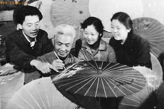 上世纪70年代,制伞大师竹振斐(左二),正在传授制作西湖绸伞的技艺。左一为宋志明。