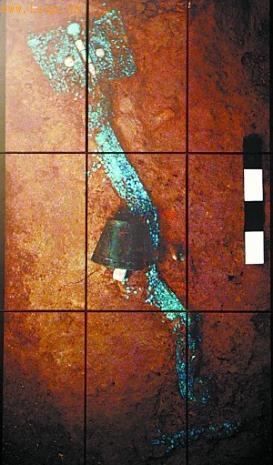 泥土里浮现出一个绿松石龙形器和一个铜铃—这幅巨大的照片挂在展厅的显要位置。可别小看这个龙形器,它是2004年度全国十大考古新发现之一,现场展出的龙形绿松石铜牌饰和它一脉相承。
