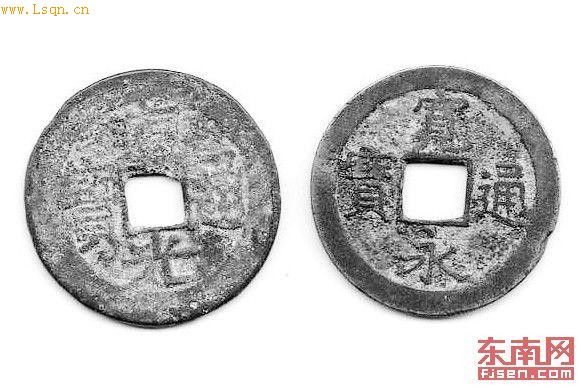渔民王某在海边沙滩上挖苦螺,居然从滩涂地里挖出两枚古铜钱,经相关行家鉴定,其中一枚还是罕见的日本古币“宽永通宝”。
