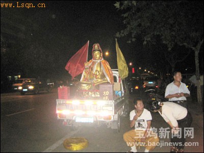 记者在现场看到,一辆甘肃牌照的小卡车上,“端坐”着一尊慈眉善目的观音菩萨塑像,“膝头”两个“功德箱”格外醒目。菩萨怎么到闹市来“逛街”了?还有“专车”接送?随着卡车旁一名穿着T恤衫的中年男子的吆喝,人们终于明白是怎么回事了。原来,菩萨身旁,一位中年男子不断地吆喝着“拜观音菩萨,保平安发财”,不时有“善男信女”在车前蒲团上向“菩萨”叩拜许愿。此时,中年男子会循循善诱地“启发”说,“许愿需要布施功德才能灵验”。记者在短短10分钟时间里看到,在中年男子的“启发”下,“菩萨”先后“接”到了数十元的“功德”。