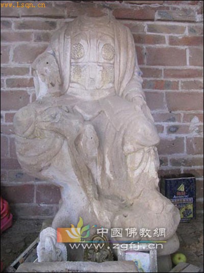 据国家文物局网站消息,该造像砂石圆雕,头已残失,高120厘米,宽65厘米,厚50厘米,坐于树根状座上,左腿自然下垂,跣足踏一类似玄武的物体,左手平置于左膝,右腿上屈置于座面上,右脚残缺。坐姿类似于观音的游戏坐,披发跣足,外着大衣,内着铠甲,胸部为人字形护心镜,胸系絆带,腰扎英雄巾。座后方刻凌乱文字数行,大多已漫漶不可辨识,依稀可见“神□七年”、“正大二□”等。