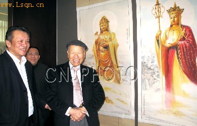 中国佛教新闻网讯 一月十五日,中国著名居士画家北雁山人—《汤余铭佛缘绘画精品展》在香港举行新闻发布会,展览将于一月二十六日在香港西方寺大雄宝殿举行,展出的八十余幅作品,让市民欣赏中国佛教书画引人入胜的魅力。图为画家汤余铭(左一)在发布会上介绍他创作的普陀山观世音菩萨等彩绘作品。(稿源:中国新闻网)