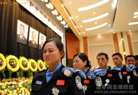 中国佛教新闻网讯 “亲爱的战友,我们接您回家”,“向维和英烈致敬”、“安息吧”……21日中午1时许,云南公安边防总队所在的昆明市滇池路一侧,布满了这样的黑白横幅;数万名警察、武警、机关干部、单位职工、学生和群众手持菊花,向在海地地震中牺牲的三名云南维和烈士敬礼或行注目礼;路上的车辆自发停车鸣笛,司机们下车肃立,向英雄致以最高的敬意。