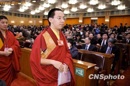 3月3日下午,全国政协十一届三次会议在北京人民大会堂开幕,十一世班禅额尔德尼·确吉杰布出席会议。
