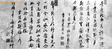 瑫(1611—1684年)的作品连在一起,为镜框水墨纸本,作于1657年。即非如一的题识为“声影了然静,香光共一寸。合家风以德,更念雪为恩。容此孤山瘦,清如吾道尊。谁意春面目,收拾在芳根。东明山观梅之作。济之十之世雪峰即非草”,拍卖价为5000~8000元。