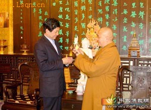 座谈中,永寿法师向山东烟台市委市政府对四川灾区的支援建设致以无尽的感恩,并向孙永春书记一行赠送了佛教纪念品结缘存念。