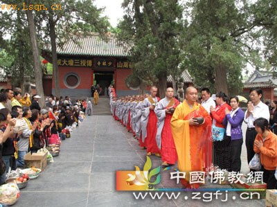 中国佛教新闻网讯 5月12日,农历三月二十九,中国嵩山少林寺庚寅年传授三坛大戒法会进入第二十天。众新戒效法佛陀托钵乞食、夜宿桥洞等苦行,在少林寺周边进行托钵等活动。来自全国各地的居士大约两千多人,分批次来到嵩山少林寺的山门外列队恭迎众戒子们,供养新戒。