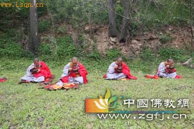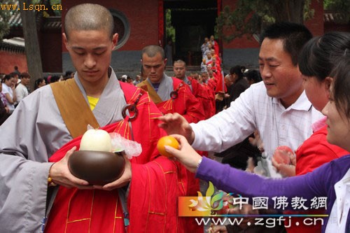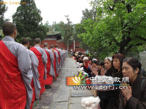 十点多,众新戒们,排班而出,受到两千多居士的虔诚供养。之后,众新戒在少林寺塔林前的草地上用斋。(信息来源:少林寺)