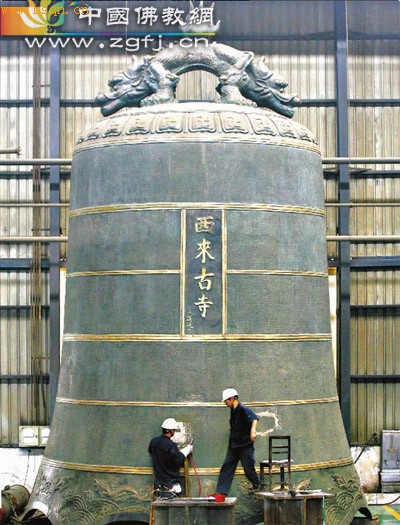 中国佛教新闻网湖北讯:昨日,武汉重工铸锻有限公司的车间里,工人们正在为刚刚铸成的世界第一大佛钟“万佛名钟”进行最后的细节“推敲”。该钟是为广西柳州西来古寺而制,整钟为锡青铜材质,重达109吨,高9米,最大直径6.06米,钟身铸有乾隆版《佛说万佛名经》经文一部,共92306字,较之前被上海大世界吉尼斯总部认定为世界最大佛钟的寒山寺108吨仿唐铜钟,“万佛名钟”在重量,高度,最大直径,铸造文字等均有超越。