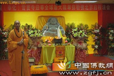 中国佛教新闻网讯:2010年7月9日上午,“弥勒回家”——中国(奉化)雪窦寺迎奉全球最大翡翠弥勒佛启程法会在北京工商联大厦隆重举行。中国佛教协会教务部宏度法师、长顺法师,中国佛教协会常务理事、奉化雪窦山资圣禅寺方丈怡藏法师,北京广化寺曙学法师,国家宗教事务局李云华处长,中佰集团总裁关继军,亚欧集团董事长田继荣,奉化市委常委、统战部长何剑波先生等教界内外200余位嘉宾出席了启程法会。法会由中国佛教协会教务部宏度法师、长顺法师和中佛协常务理事、雪窦寺方丈怡藏法师共同主法。