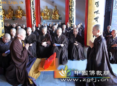 中国佛教新闻网讯 2010年8月25日,农历七月十六日,浙江宁海县慈云佛学院在结夏圆满之际,于大雄宝殿举行了如法、庄严的受筹和自恣仪式,约有165位僧众参加。
