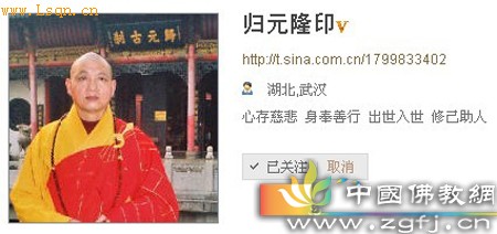 近日,归元寺方丈隆印法师在新浪开微博讲传佛法引起社会广泛关注,众多网友和博友议论纷纷。据页面显示,其最早的一条微博发表于8月30日,开博不过短短12日,截至发稿时间,隆印法师的微博粉丝量已经达到26293人,并且还在不断刷新之中。