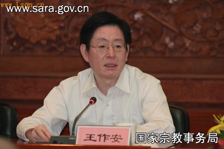 王作安在讲话中说,中央决定由我担任国家宗教事务局的主要领导,深感使命光荣,深知责任重大。我将全身心投入,团结局党组成员,带领全局干部,依靠全国宗教工作干部,齐心协力,努力工作,在历届领导班子打下的良好工作基础上,推动宗教工作不断取得新的进展。一要政治坚定。坚定理想信念,加强党性修养,牢固树立科学发展观和正确政绩观,讲政治、顾大局、守纪律,在政治上、思想上、行动上同党中央保持高度一致。二要尽职尽责。要安心宗教工作,热爱宗教工作,要有一股锐意进取的劲头,根据形势发展的要求和实际情况的变化,更新观念,创新举措,着力解决宗教领域存在的重点、热点和难点问题。三要团结合作。坚决贯彻民主集中制原则,充分发扬民主,集思广益,从善如流。充分发挥党组成员作用,讲团结、讲风格、讲纪律,开展正常的批评与自我批评,精诚团结,相互补台,建设一个坚强有力的领导班子。四要清正廉洁。始终牢记“两个务必”,重视党风廉政建设。树立正确的价值观,修身立德,崇俭养廉,自觉抵制各种不正之风和利益诱惑,自觉接受组织和同志们的监督。五要努力学习。要深入学习中国特色社会主义理论体系,完整、准确理解科学发展观,保持政治上的坚定和理论上的清醒。要全面学习做好宗教工作必备的各项知识,开阔眼界和胸怀,努力提高驾驭全局的能力