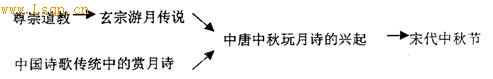 再一种以朱红为代表,她认为“由于皇帝(唐玄宗)的提倡,道教在当时兴盛起来。中秋玩月的那种虚空之境、月宫神仙的不老传说,与道教的思想开始融合,因此,原本即是诗歌传统题材之一的中秋赏月,则由于道教思潮的促使,而在唐代玄宗朝以后开始兴起”,并以如下的一个线性图来说明中秋节在宋代的形成: