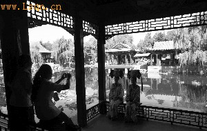 昨日,颐和园谐趣园,一名游客用相机拍摄“宫女”。谐趣园经过440天的修缮后,向游客免费开放。本报记者 薛珺 摄