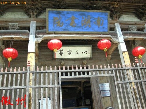 南湖书院座落南湖北岸,是所具有传统徽派建筑风格的古书院。书院由志道堂、文昌阁、启蒙阁、会文阁、望湖楼、祗园六部分组成。书院前临一湖碧水,后依连栋楼舍,粉墙黛瓦、碧水蓝天、交相辉映。