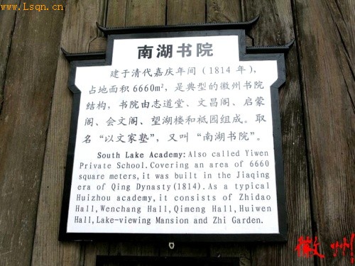 南湖书院于明永乐年间始建。明末,宏村人在南湖北畔建六所私塾,又称“依湖六院”,以供子弟授业解惑。清嘉庆十九年(1814年),将依湖六院合并重建,取名以文家塾,亦名南湖书院。