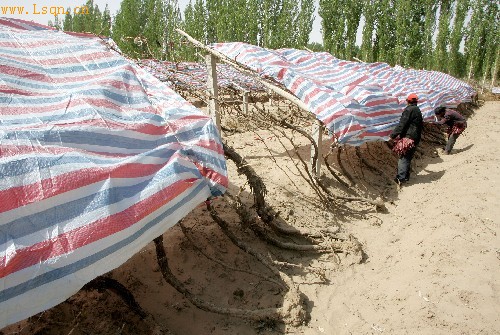 农民为葡萄藤穿“御寒衣”