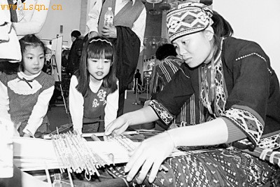 海南黎族传统纺染织绣技艺传承人在演示。摄影/谌强