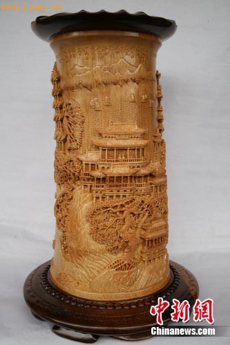 黄鹤楼等中国四大名楼现身竹雕笔筒。陆永忠 摄