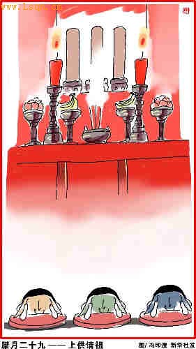年谣称:“腊月二十九,上坟请祖上大供”。 对于祖先的崇拜,在我国由来已久。事死如生不仅是孝道的重要标志,也是尊老敬老的美德。春节是大节,上坟请祖仪式也就格外郑重。上坟请祖的时间,大多数地区在二十九日早晨请祖。 据汉代崔寔的《四民月令》记载:“正月之朔是为正月,躬率妻孥,洁祀祖祢。及祀日,进酒降神毕,乃室家尊卑,无大无小,以次列于先祖之前,子妇曾孙各上椒酒于家长,称觞举寿,欣欣如也。”这说明,早在汉代我国的祭祖活动就已经是春节中一项十分重要的活动了。