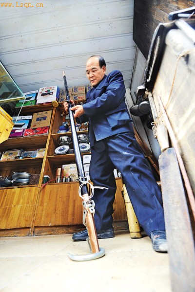文志飞在老秤店内清洁一杆能称200公斤的大秤。新华社记者 龙弘涛摄