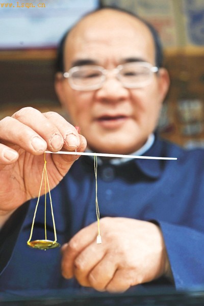 文志飞展示一杆称重精确度达0.01克的微型秤。新华社记者 龙弘涛摄