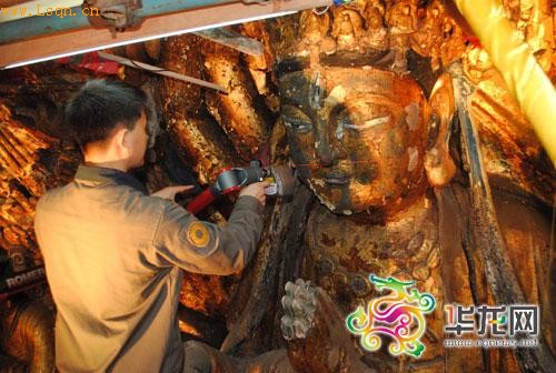 因为是尽可能的以历史保留下来的材料进行修复工作,所以“游客们看到的修复好的千手观音并不是‘金光闪闪’,色泽将会暗沉一些,但仍然不失艺术的恢弘。”(黄海 来源:华龙网)