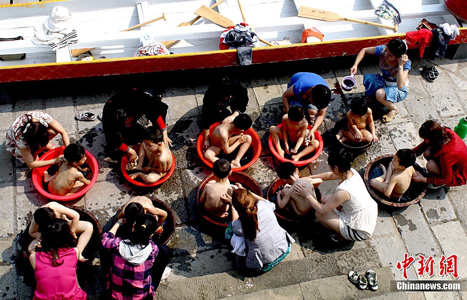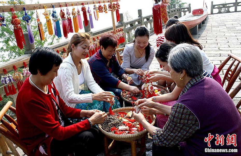 5月27日,随着端午节的临近,屈原[注: 屈平(约公元前339年~约公元前278年)是中国文学史上第一位伟大的爱国诗人。字原,通常称为屈原,又自云名正则,字灵均,汉族,战国末期楚国丹阳(今湖北秭归)人,楚武王熊通之子屈瑕的后代。]故里秭归[注: 秭归县-秭归位于中国湖北省西部,地处川鄂咽喉长江西陵峡两岸。面积2427平方千米,人口42.3万,汉族为主。西汉置秭归县。]县的节日气氛渐浓。当地人按照端午习俗,正在用艾叶给小孩洗澡、给老人泡脚,制作香袋、挂香袋,以期驱邪祛病,求吉祈福,同时也弘扬着尊老爱幼的美德。中新社发 王爱平 摄