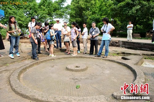 考古专家介绍钓鱼城清代用于粮食生产的石碾盘。