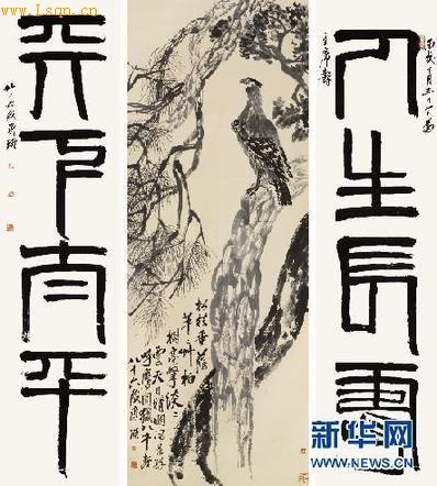 这是以4.255亿元人民币成交的齐白石[注: 白石 (1927~),本名周德恒。河北乐亭人。中共党员。1945年参加革命。1947年开始发表作品。2009年加入中国作家协会。]最大尺幅作品《松柏高立图·篆书四言联》。 新华社发