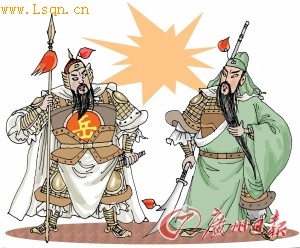 关羽和岳飞都是武将,按照《三国演义[注: 《三国演义》全称《三国志通俗演义》,是一部长篇历史小说,作者是明朝的罗贯中。《三国演义》是中国古代长篇章回小说的开山之作,是中国古代四大名著之一,与《西游记》、《水浒传》、《红楼梦》齐名。]》和《说岳全传》的描述,两人都有万夫不挡之勇,岳飞手中的沥泉神枪,也和关羽的青龙偃月刀[注: 青龙偃月刀又名“冷艳锯”是小说《三国演义》中关羽的武器。因而青龙偃月刀又被简称为“关刀”或“关王刀”。青龙偃月刀是《三国演义》出现的第二把兵器,]一样,可以进入兵器谱前十名。