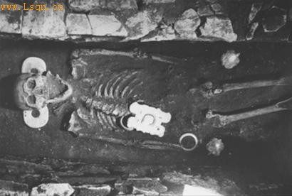 牛河梁第五地点一号冢1号墓里手握双龟的神秘老人。 记者 潘恩战 摄
