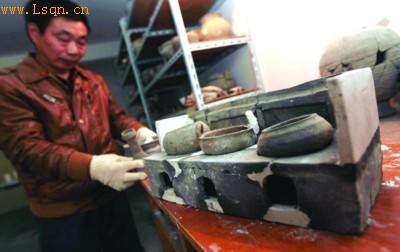 另外,在此次发掘的另一座墓葬中,一套完整的陶制锅灶也出现在考古人员面前。这套两千多年前的灶具,不仅有灶台,灶台上还有三个灶眼,上面则分别安放着锅、甑和釜等蒸煮器物。任队长说:其实甑说白了就是现在的蒸笼,它是通过底部的孔洞,利用鬲中的蒸汽将甑中的食物煮熟。“这个距今两千多年的甑,可以说是现在蒸笼的鼻祖了。 ”(实习生 汪杰、记者 王素英文/摄)